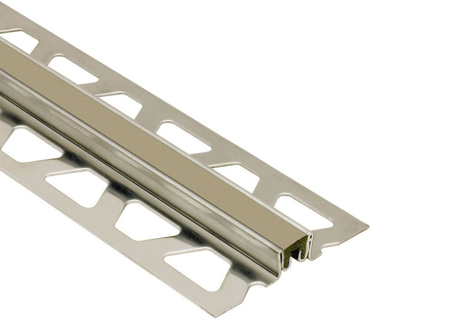 Schluter-DILEX-KSN is a heavy-duty surface joint profile with stainless steel or aluminum anchoring legs that protect tile edges. It features a 7/16 (11 mm)-wide, soft thermoplastic rubber movement zone that separates individual fields in the tile covering and forms the visible surface.