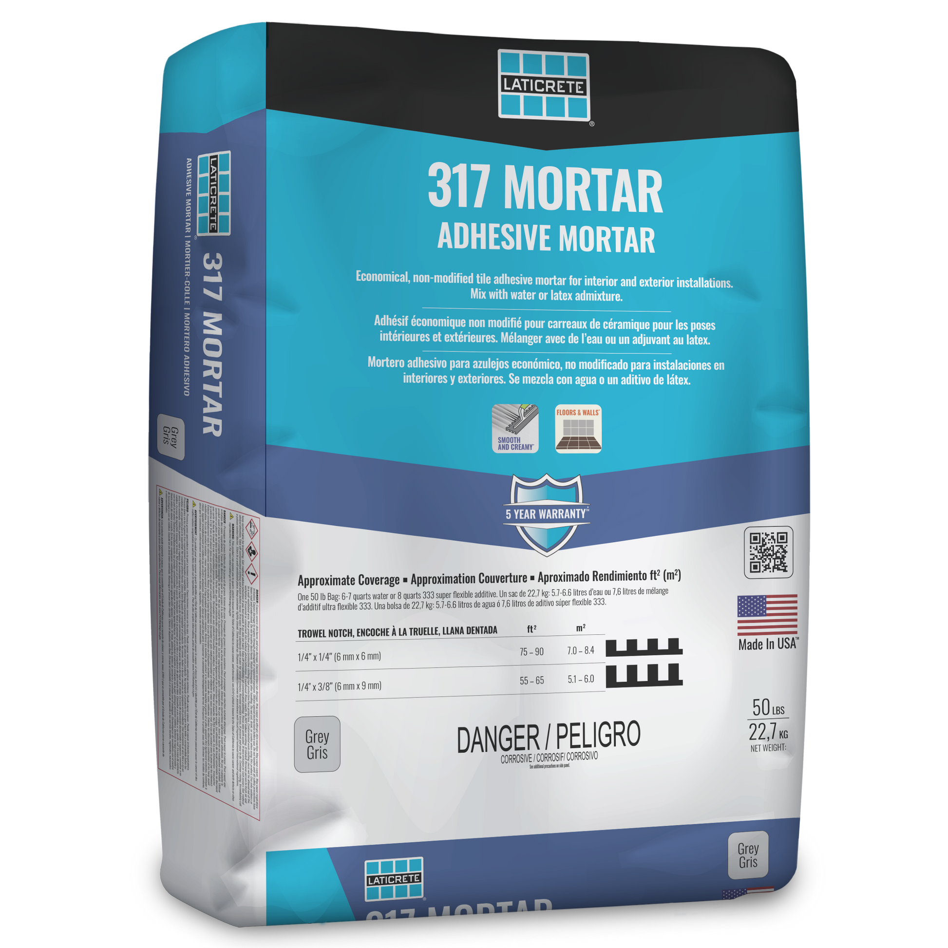 Laticrete - 317 Adhesive Mortar - Economical Non-Modified Tile Adhesive is a bagged cementitious powder. It is mixed with either water or latex admixture for installing ceramic tile and stone using the thin-set method of installation. 317 Mortar must be fortified with 333 Super Flexible Additive or 3701 Mortar Admix for exterior use, porcelain, mosaic, glass and stone tiles, and heavy traffic areas.