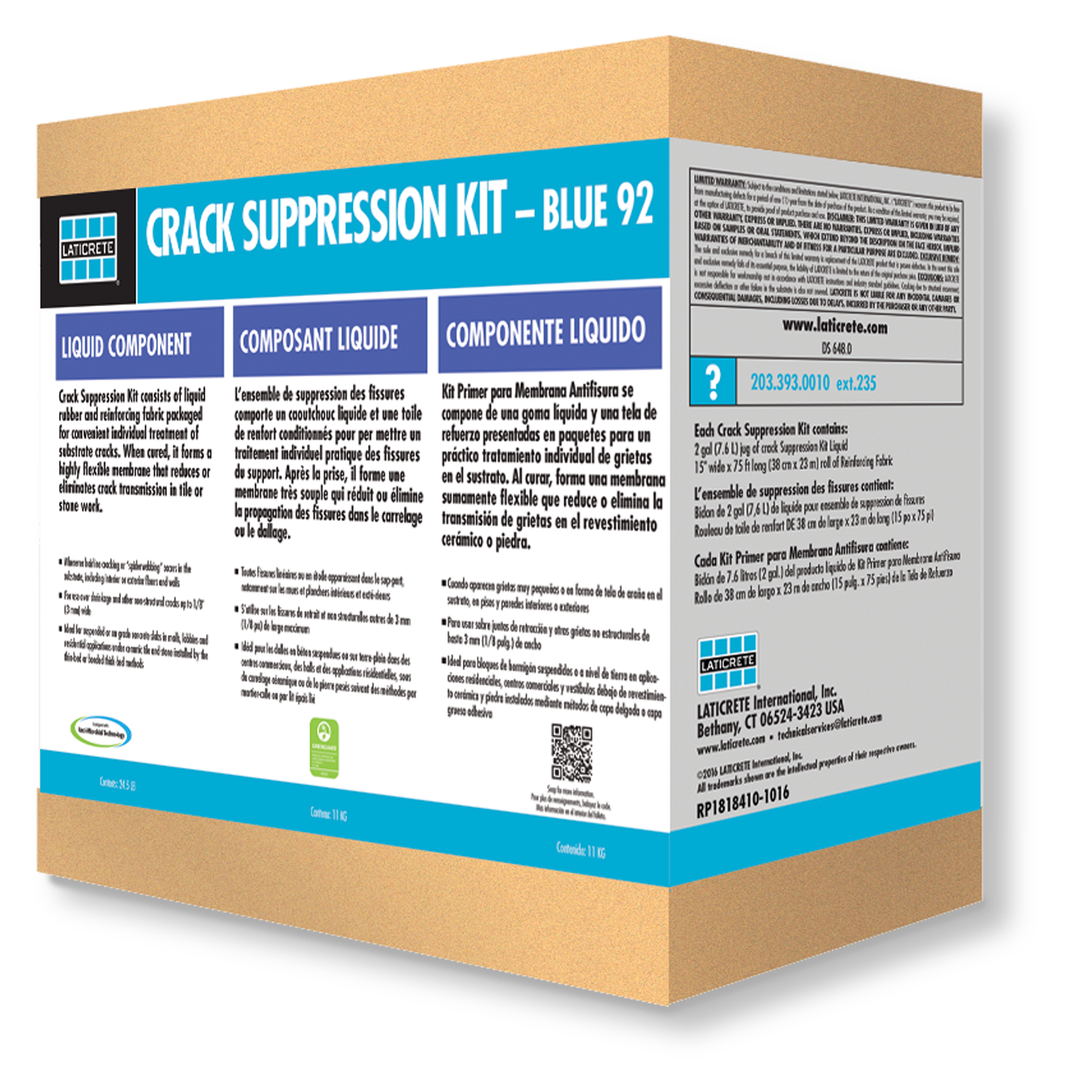 Laticrete - Blue 92 Crack Suppression Kit & Anti-Fracture System is a two-part anti-fracture, liquid rubber system formulated to prevent substrate cracks from transmitting through tile, stone, or other surface finishes. Designed for both interior and exterior installations, the Blue 92 Kit is a proven solution for protecting tile from structural movement and hairline cracking. This convenient kit includes both the liquid membrane and reinforcing fabric, making it ideal for targeted crack isolation or full-coverage applications.