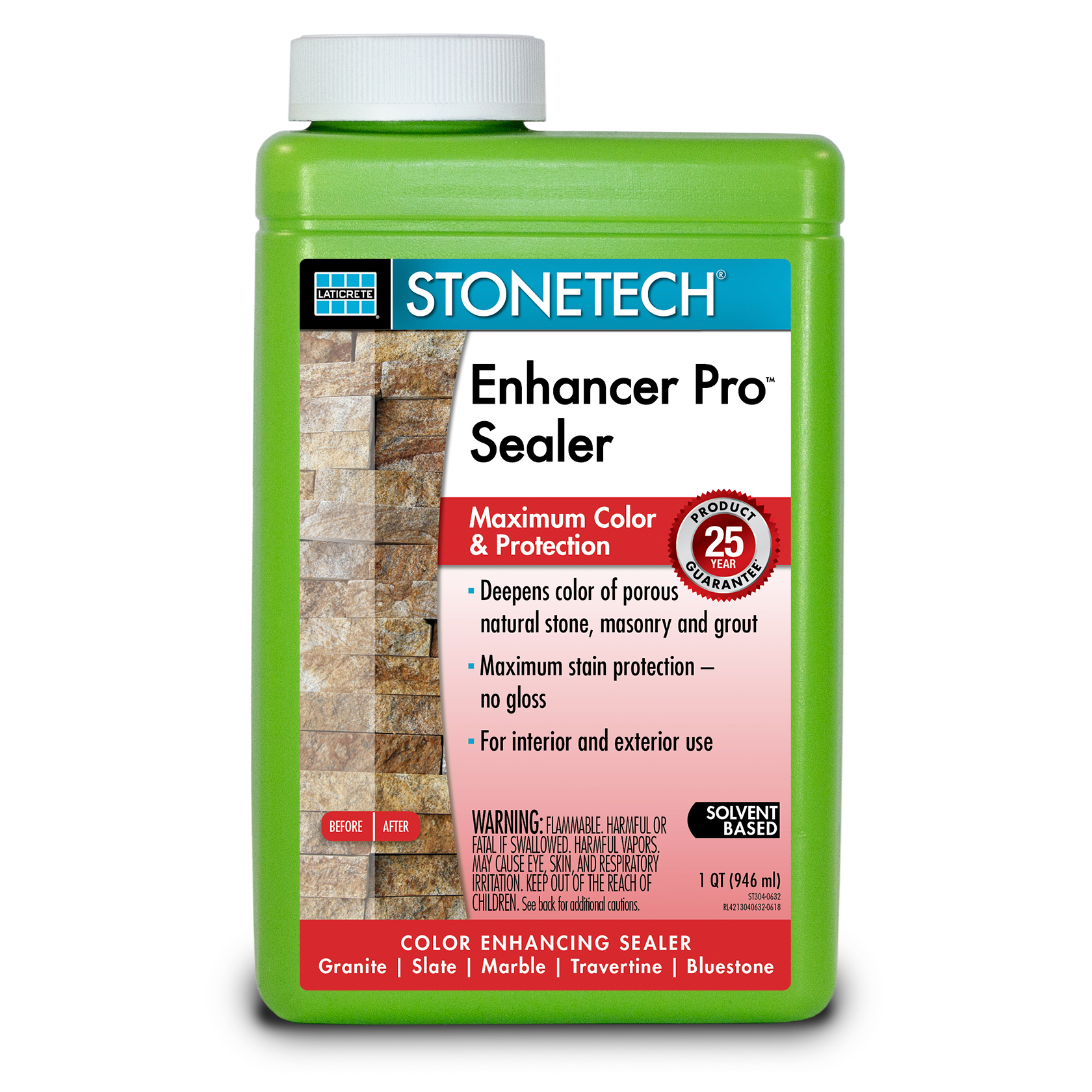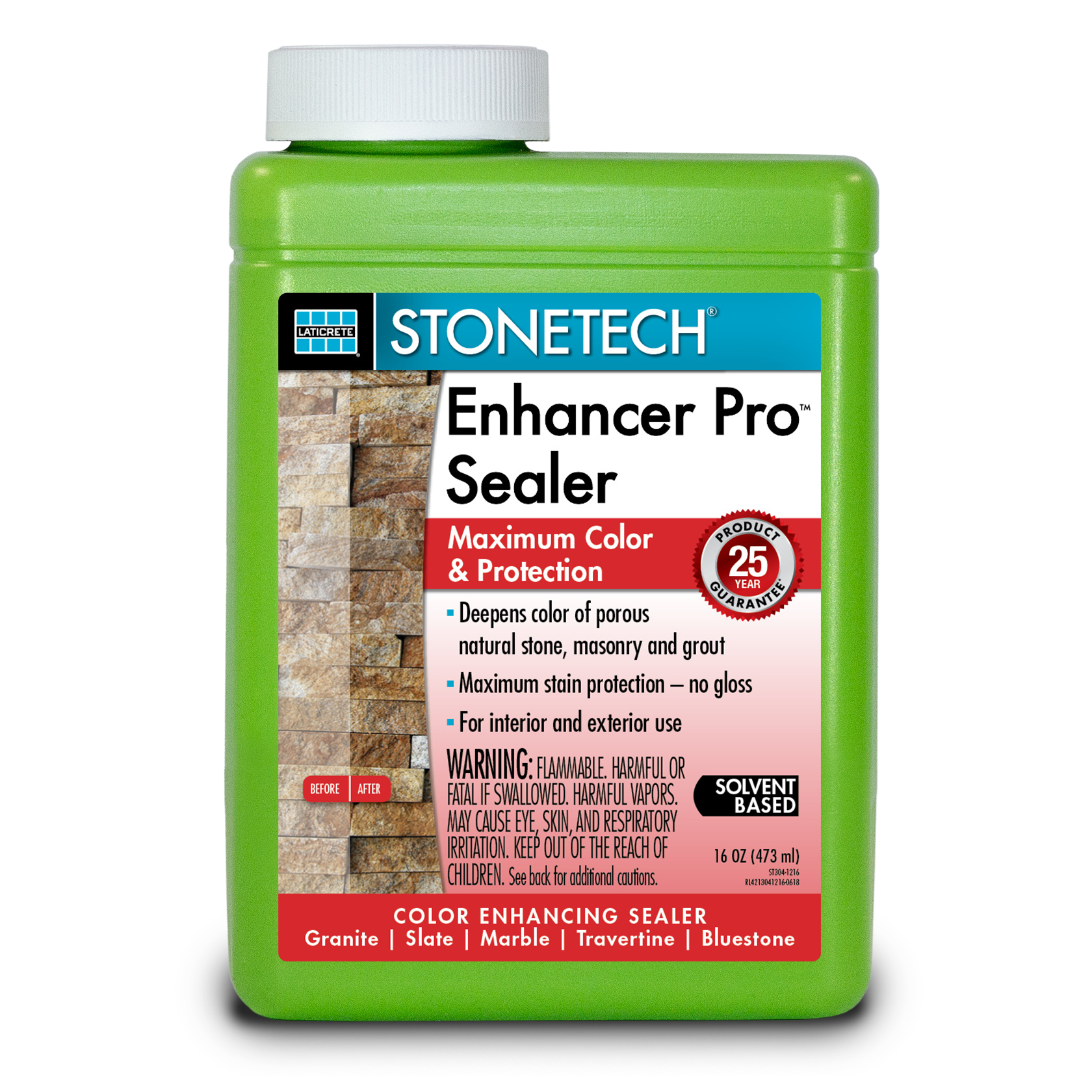Stonetech - Enhancer Pro Sealer (All Sizes) by Laticrete is the color enhancing, penetrating sealer that provides maximum color and stain protection on natural stone, masonry and grout. It deepens the natural rich color of porous surfaces without altering the finish and penetrates deep to protect it from staining. This solvent-based enhancing sealer is of professional grade, weather and UV resistant, and designed for use in interior and exterior applications. Great for augmenting the look of a stone floor or reviving a worn surface.