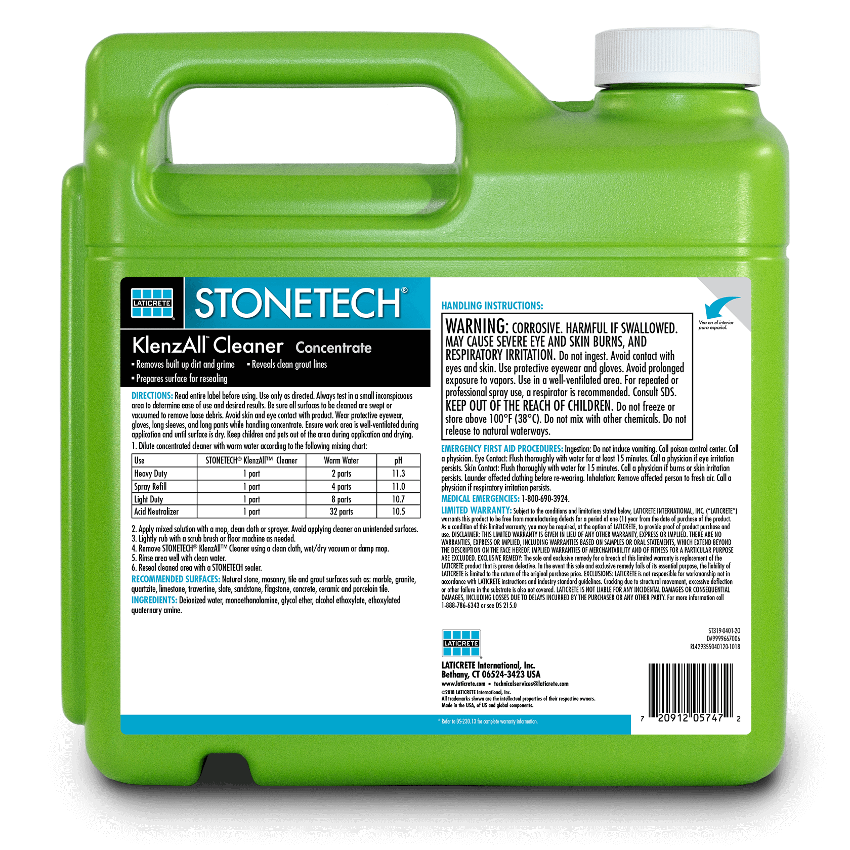STONETECH KlenzAll Cleaner is the heavy duty strength, alkaline cleaner made to remove the toughest dirt, grease and grime from natural stone, tile, masonry and grout. It cleans, degreases and prepares the surface for resealing, is safe on stone and is low VOC. Available in ready-to-use and concentrate formulas for use on heavily used areas such as countertops, walls or floors.