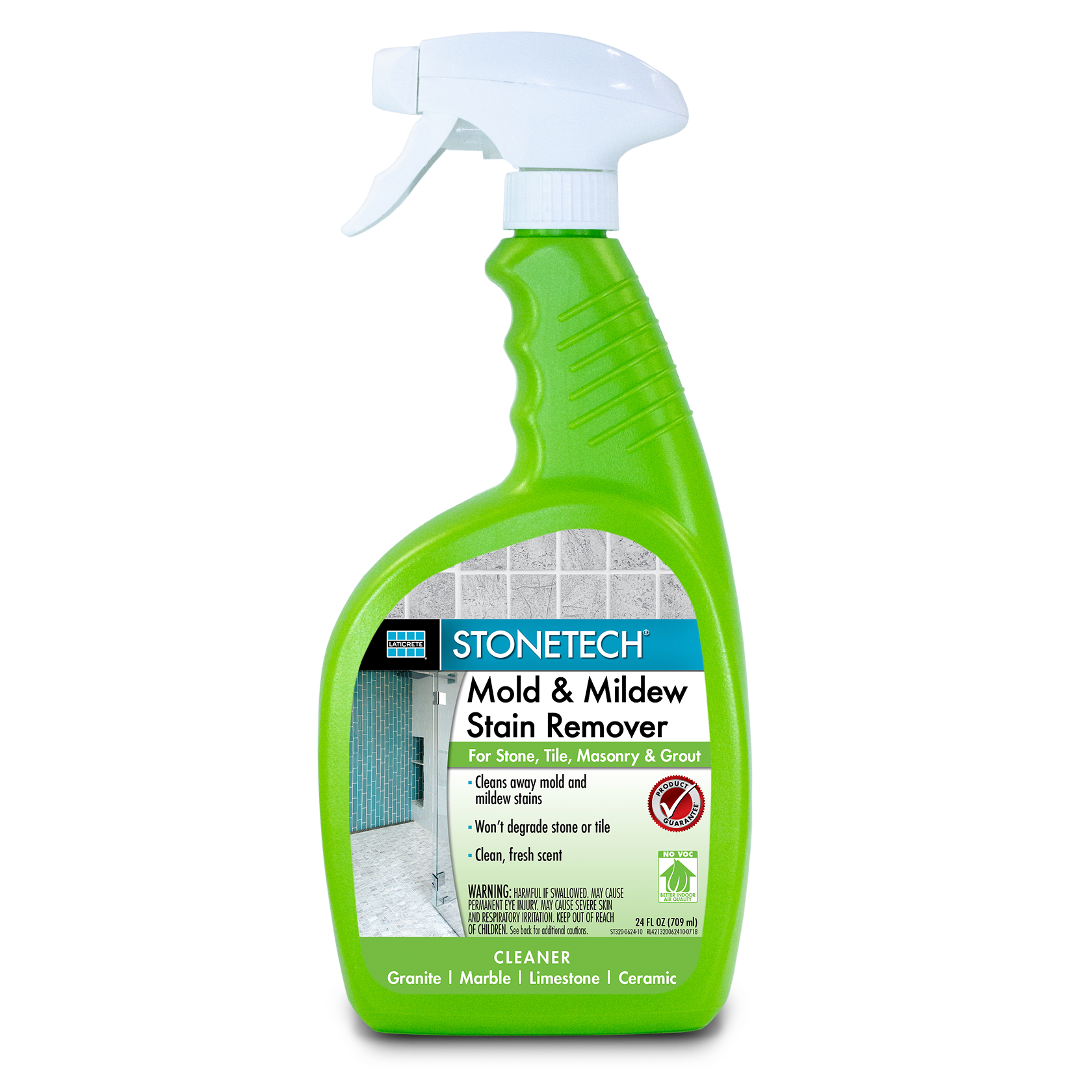 Stonetech Mold & Mildew Stain Remover Spray (24oz) by Laticrete is a ready-to-use, powerful specialty cleaner specifically formulated to remove mold, mildew and even algae on natural stone, tile, masonry and grout. It quickly dissolves unsightly mold and mildew stains without degrading or harming the surface. STONETECH Mold & Mildew Stain Remover features a foaming action sprayer that allows the cleaner to adhere well to vertical applications and avoid messy drips. Great for bathroom showers and vanities, kitchen countertops, backsplashes, patios and more.